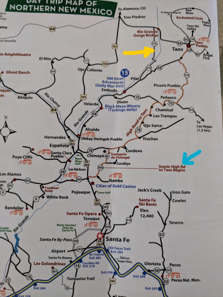 | Map of the area from the brochure we got at the Santa Fe Visitor's Center - we decided to take the "Scenic High Road to Taos", proceed around the Enchanted Circle counter-clockwise, and end by seeing the Rio Grande Gorge Bridge. Because we would take Route 64 to the bridge, we decided we would take the smaller road back to route 68 (the "Low" road from Taos to Santa Fe). |